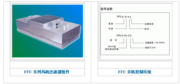 风机过滤器机组是有一个高性能、压出式、直趋式后径向叶片风机、马达置于不锈钢箱体中,配合一个可更改的高效过滤器(效率为99.99%在0.3微米的微粒)或超高效 过滤器(效率为99.9995%在0.12微米的微粒)。